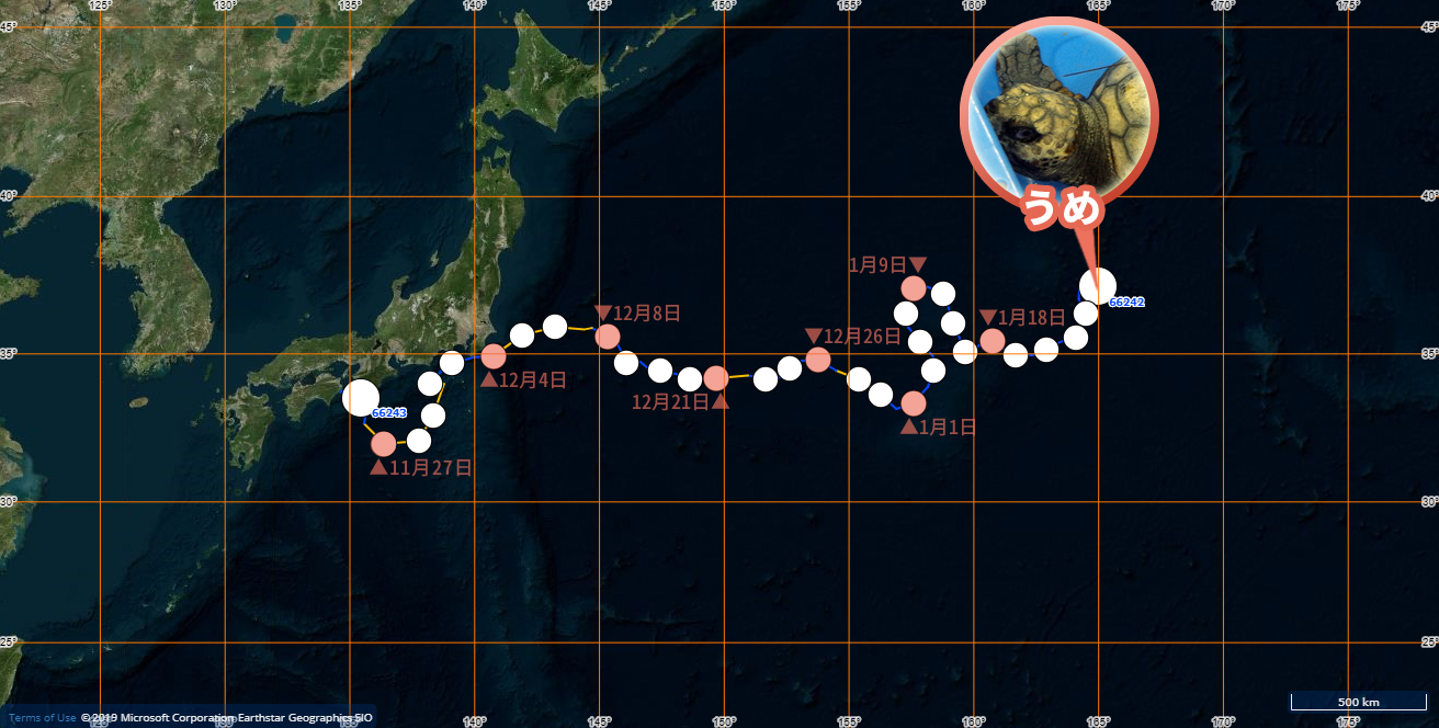 発信機付きウミガメ位置情報2019年1月31日うめみかん