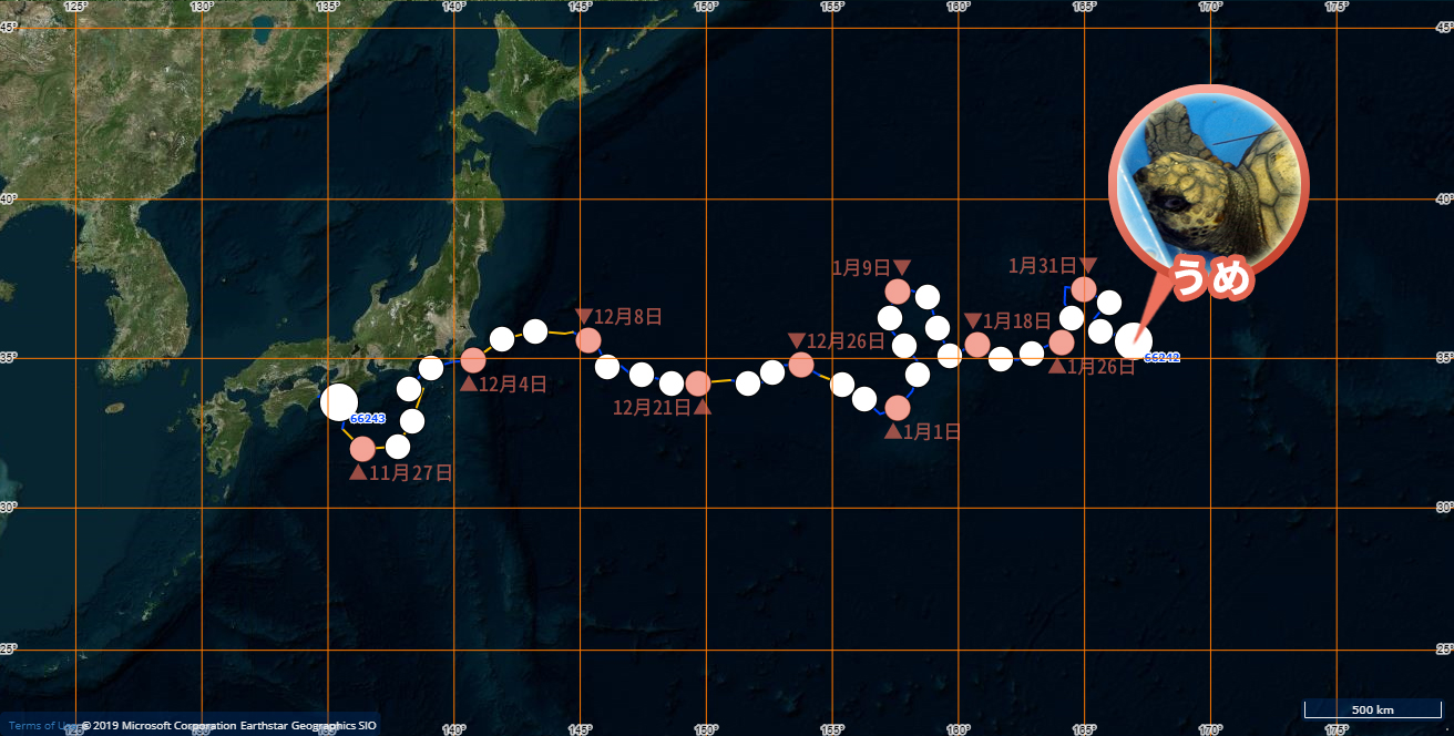 発信機付きウミガメ位置情報2019年2月27日うめみかん