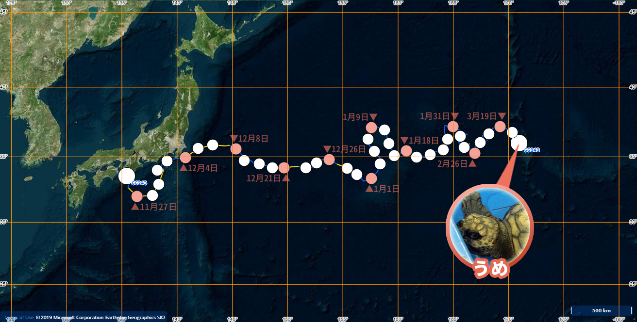 発信機付きウミガメ位置情報2019年3月27日うめみかん