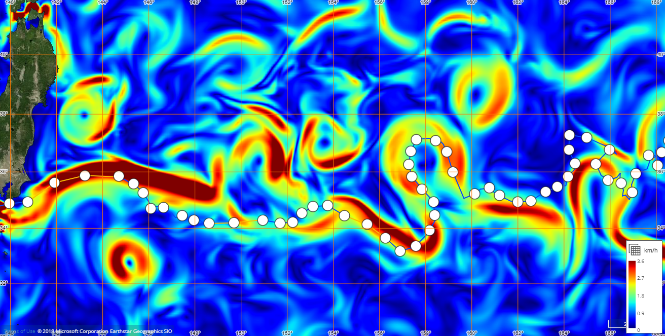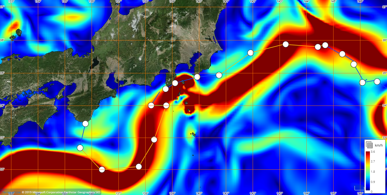 この位置は完全に黒潮の流れに乗っていて、期待通りの経路ですが移動速度は予想以上でした。