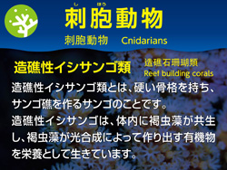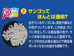 [ 小常識2 ] 在活的珊瑚身上有咖啡色和綠色等顏色。此顏色是珊瑚共生的褐蟲藻色,珊瑚本身幾乎是透明的。珊瑚的白化現象是由於高水溫等褐蟲藻漸漸消失所造成的。 |