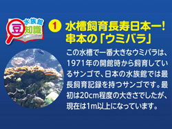 [ 小常識1 ] 此水槽最大的海薔薇是從西元1971年開館時所飼養的珊瑚,並是全日本水族館中擁有最長的飼養紀錄的珊瑚。當初只有20公分長,現在有1公尺長以上。 |