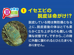 [ 小常識1 ] 龍蝦的脫皮是冒著生命危險的 由於在脫皮時處於無防備的狀態,在剛結束脫皮後身體也非常柔軟難以站立而處於危險狀態。因此,此時如遭受外敵攻擊,很容易被擊敗。 |