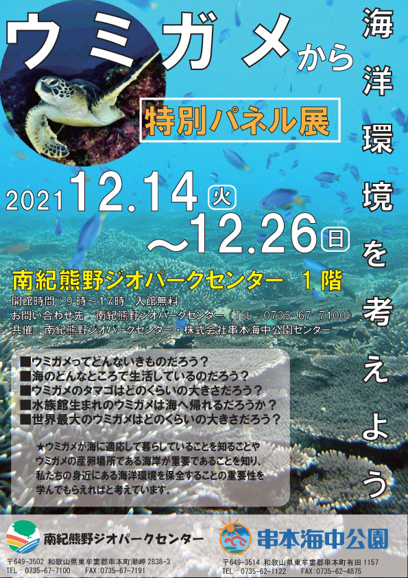 南紀熊野ジオパークセンターと当センターとの共催で「ウミガメから海洋環境を考えよう」と題した特別パネル展を催します。当センターからはウミガメ類に関する紹介パネルの展示を行います。