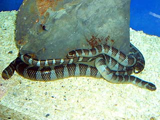 | コブラ科。ウミヘビの仲間では、最も名が知られたウミヘビです。南西諸島に生息しますが、黒潮にのって北上することがあり、串本でもまれに見つかります。エラブウミヘビは海で泳ぐために尾がヒレ状になっていますが、陸上の岩場や洞穴を隠れ家にしていて、頻繁に陸に上がります。沖縄では、このウミヘビを燻製(くんせい)にして、伝統的な沖縄料理の食材として使います。あまり咬まないとされていますが、飼育していて慣れてくると、餌の時に口を開けて何でも咬みつこうとします。咬まれると死ぬこともあるので、注意が必要です。 | |