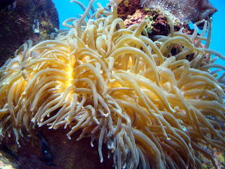 ウメボシイソギンチャク科。大きくなると50cm以上にもなる大型のイソギンチャクです。比較的浅い海の岩場にすみ、本州中部から九州にかけて分布します。クマノミと共生していることが多いイソギンチャクです。