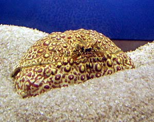 | カラッパ科。体長15cmにもなる大型のカニで、普段は砂に潜り目だけを砂の上に出しています。エサとなる巻き貝やヤドカリが近づくと、砂から出てこれを捕まえます。ハサミの一方は缶切りのようになっており、これで巻貝をくりぬいて中身を食べます。 このカニの仲間は全て“〜カラッパ”という奇妙な和名がついています。これは、学名のCalappaから来ています。この語源はヤシの実を意味するマレー語だそうで、なるほどカラッパ類の丸い体はそれに似ています。 |