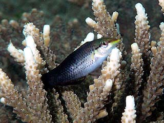 展望塔で見られるクギベラの多くは幼魚か若魚です。親は口が細長く飛び出していますが、幼魚のころはその特徴はあまり見られません。サンゴの間をよく泳いでいます。体長5cm。