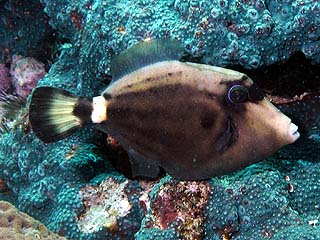 尾びれの付け根に白いバンドが入り、目と目の間が黒いカワハギの仲間です。展望塔では、珍しい魚です。体長10cm
