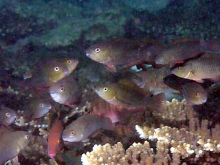 テーブルサンゴの上を群れで泳いでいます。5〜10cmの若魚が見られます。